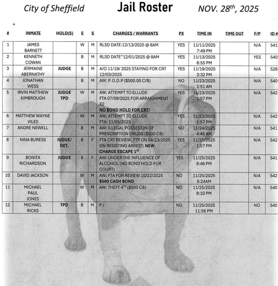 The Sheffield Jail Roster is updated Monday through Friday at 8:00 AM. This is the roster for November, 28th, 2025.