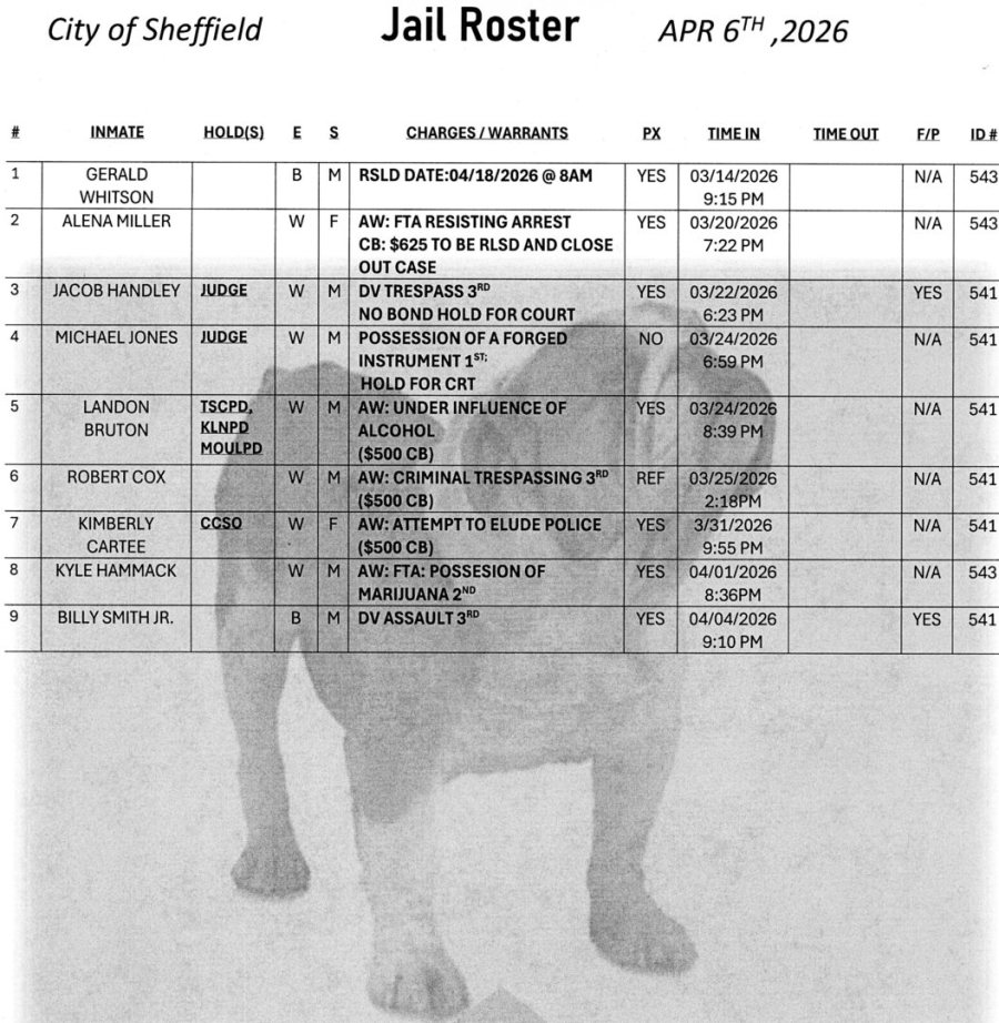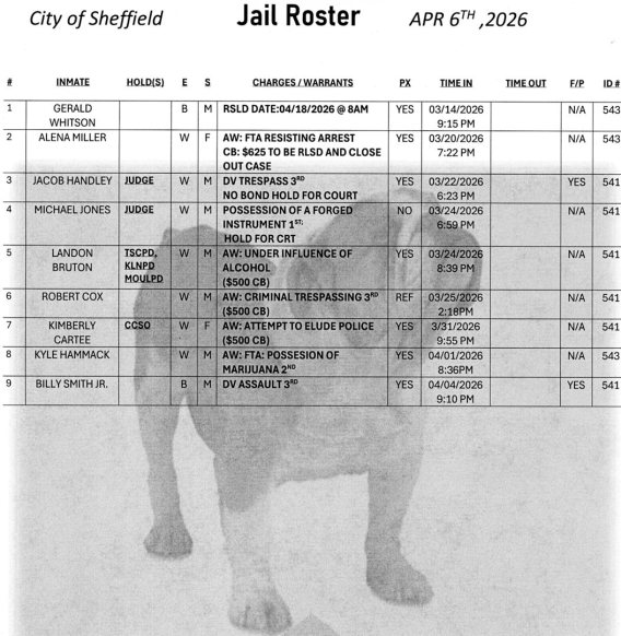 The Sheffield Jail Roster is updated Monday through Friday at 8:00 AM. This is the roster for April, 13th, 2026.